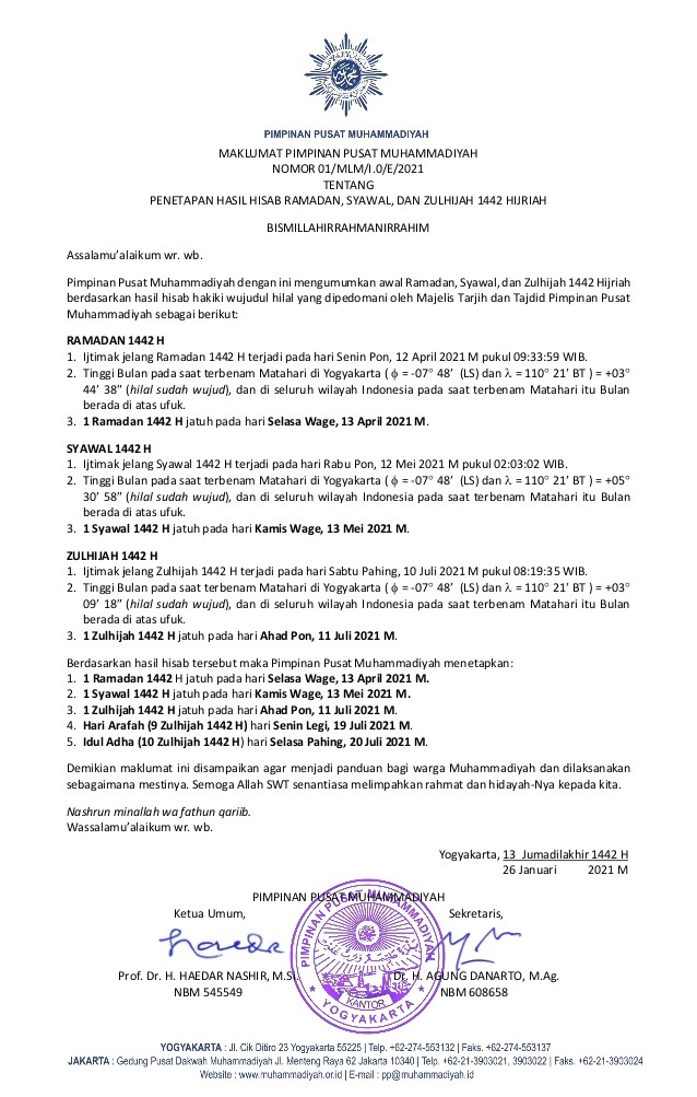 Dalam maklumat yang terbit 26 Januari 2021 tersebut, juga sudah diketahui 1 Syawal 1442 atau Lebaran akan jatuh pada Kamis Wage 13 Mei 2021.