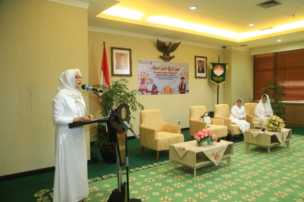 Ketua DWP Kementerian Agama Farikhah Nizar ali dalam sambutannya mengatakan kegiatan Nuzulul Quran ini merupakan rangkaian dari kegiatan Gebyar Ramadan 1443 H yang mengambil tema “Ramadhan dan Al-Qur’an sebagai Madrasah Membentuk Akhlak Keluarga”.