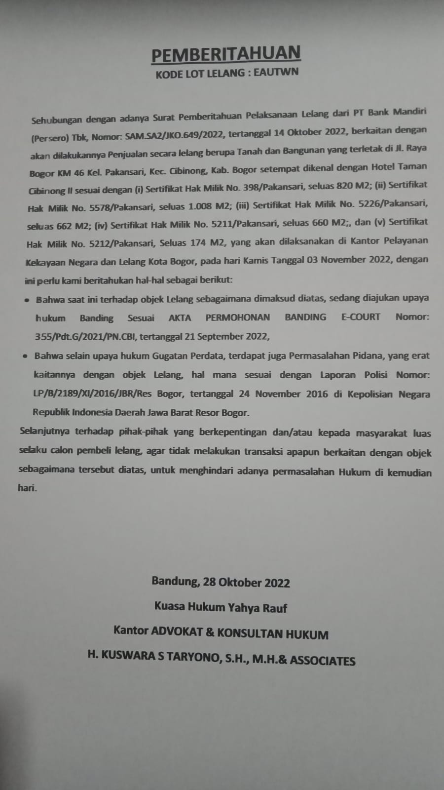 Sehubungan dengan adanya surat pemberitahuan pelaksanaan lelang dari PT Bank Mandiri (Persero) TBK. Nomor : SAM. SA2/JKO.649/2022, tanggal 14 Oktober 2022, berkaitan dengan akan dilakukannya penjualan secara lelang tanah dan bangunan yang terletak di Jl.Raya Bogor KM 46 Kel. Pakan Sari, Kec. Cibinong. Kab. Bogor. Setempat dikenal dengan Hotel Taman Cibinong II sesuai dengan (i) Sertifikat Hak Milik No. 398/Pakansari, seluas 820 M2, (ini) Sertifikat Hak Milik No. 5578/Pakansari, seluas 1008 M2, (iii) Sertifikat Hak Milik No. 5226/Pakansari, Seluas 662 M2, (iv) Sertifikat Hak Milik No. 5211/Pakansari, 660 M2, dan (v) Sertifikat Hak Milik No. 5212/Pakansari, seluas 174 M2, yang akan dilaksanakan di kantor Pelayanan Kekayaan Negara dan Lelang Kota Bogor, pada hari Kamis Tanggal 03 November 2022, dengan ini perlu kami beritahukan hal – hal sebagai berikut.