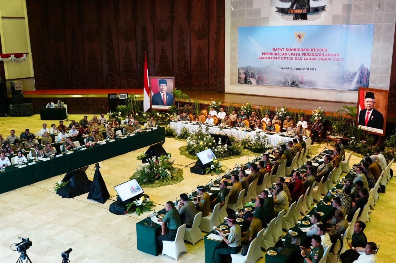 Menteri Koordinator Bidang Politik, Hukum, dan Keamanan (Menko Polhukam), Mahfud MD memimpin langsung Rapat Koordinasi Khusus (Rakorsus) Peningkatan Upaya Penanggulangan Karhutla pada Masa El Nino Tahun 2023 di Manggala Wanabakti, Jakarta, Senin (09/10/2023). Peserta rapat terdiri dari para Menteri dan Kepala Lembaga, Gubernur wilayah rawan karhutla beserta Pangdam/Danrem dan Kapolda, Kepala Kejaksaan Tinggi, para pelaksana teknis lapangan BPBD, serta para Kepala UPT Kementerian LHK.
