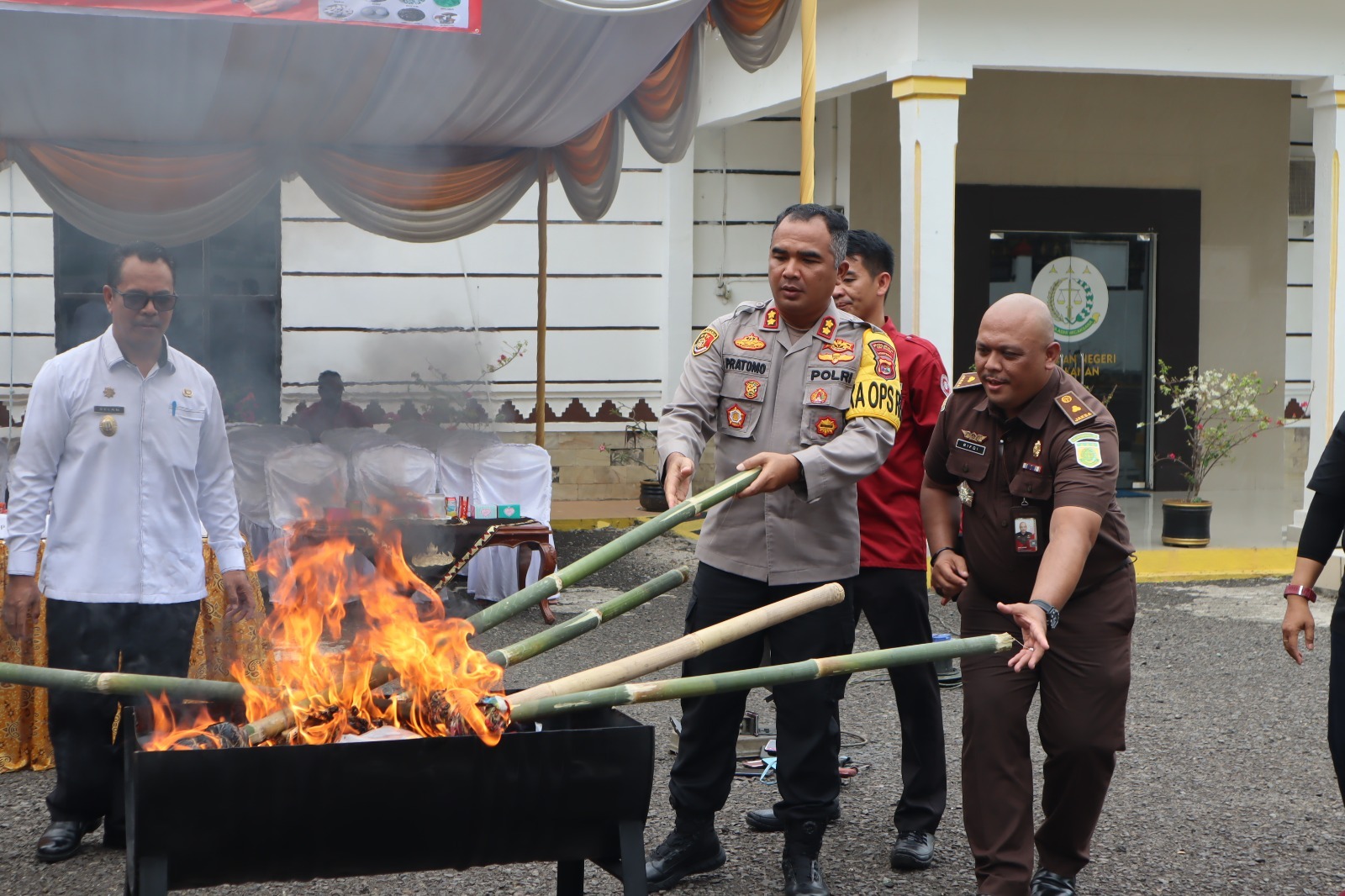 Kegiatan pemusnahan barang bukti tersebut dihadiri Kapolres Way Kanan AKBP Pratomo Widodo, Kepala Kejaksaan Negeri Way Kanan Dr. Afrillianna Purba, Asisten I Pemkab Way Kanan Selan, anggota Kodim 0427/Way Kanan Serma Dominggus, Penyidik BNNK Way Kanan, Panitera Pengadilan Negeri Way Kanan, Kepala Pam Lapas Kelas IIB Way Kanan, Kasat Pol-PP, Dpc Granat Way Kanan serta para pejabat Kejaksaan Negeri Way Kanan.